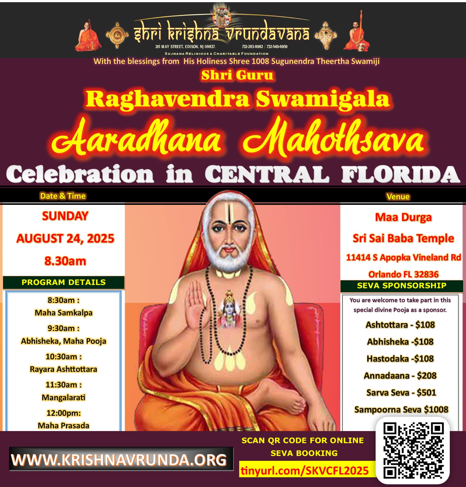 Your participation and support will bless the event with divine grace. Let’s come together to celebrate the legacy of Sri Guru Raghavendra Swamigalu!