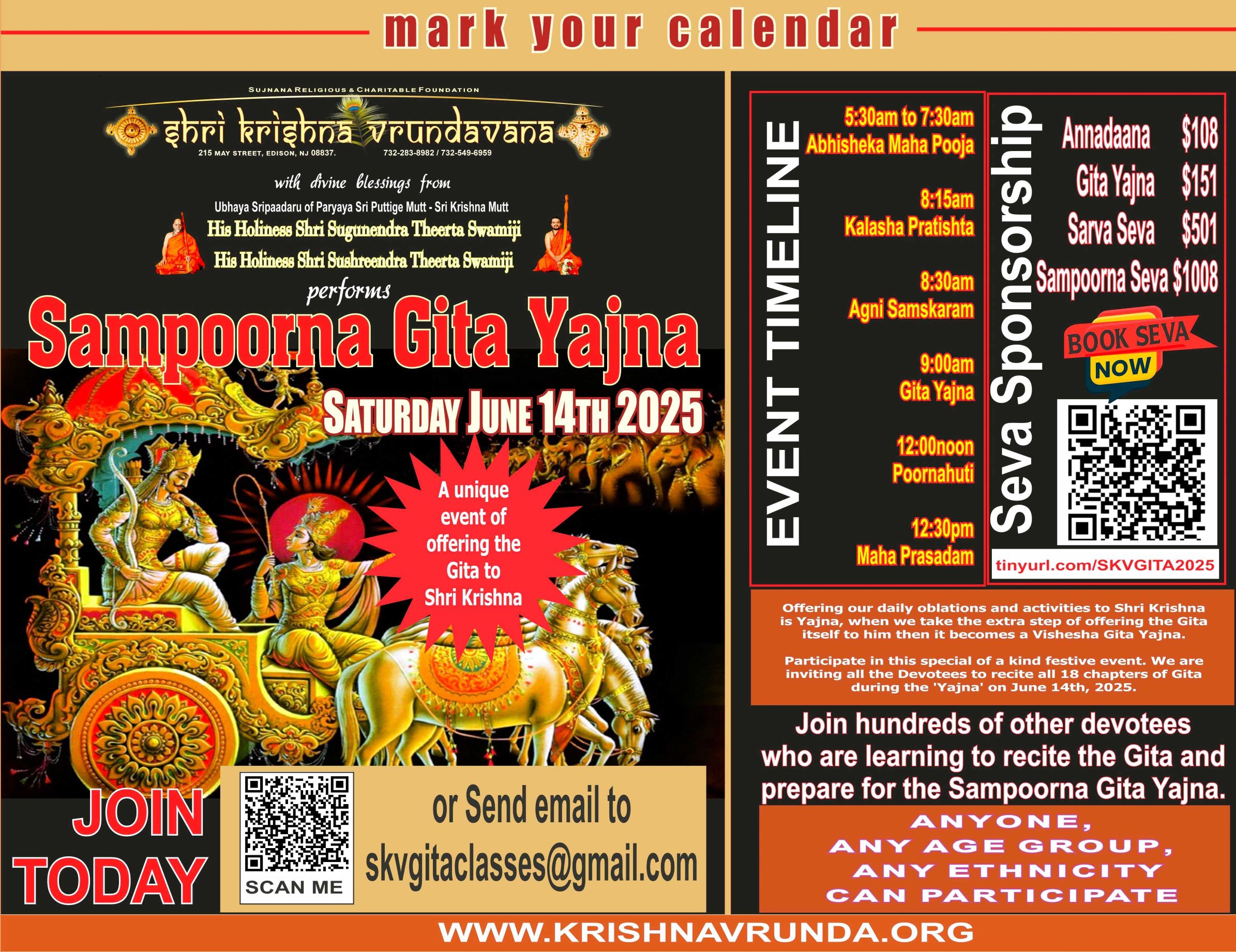 Join us for a unique and sacred event—the Sampoorna Gita Yajna, an offering of the divine Bhagavad Gita to Shri Krishna. This powerful yajna is blessed by His Holiness Shri Sugunendra Theertha Swamiji and His Holiness Shri Sushreendra Theertha Swamiji, ensuring spiritual fulfillment and blessings for all participants.
