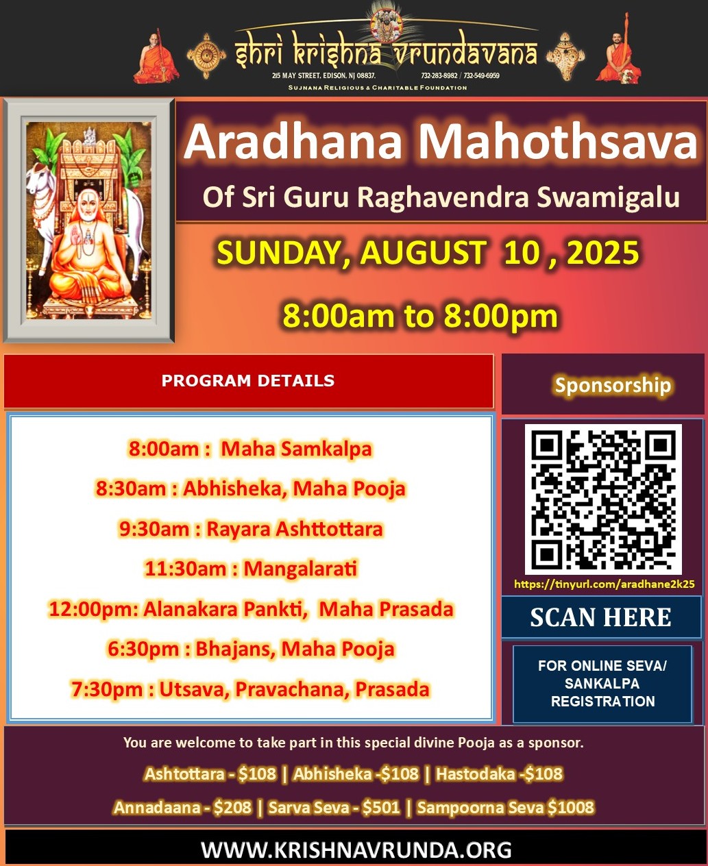Join us for the divine Aradhana Mahothsava of Sri Guru Raghavendra Swamigalu on Sunday, August 10, 2025, from 8:00 AM to 8:00 PM.