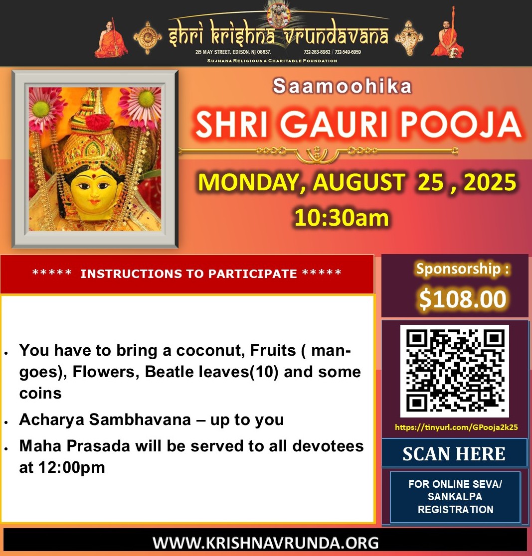 Join us for the sacred Shri Gauri Pooja on Monday, August 25, 2025, at 10:30 AM.
