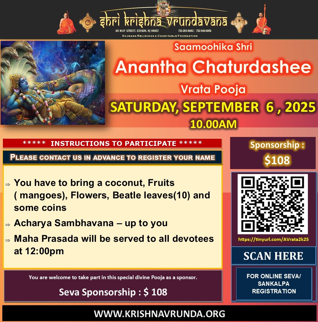 Join us for the sacred Anantha Chaturdashi Vrata Pooja on Saturday, September 6, 2025 at 10:00 AM