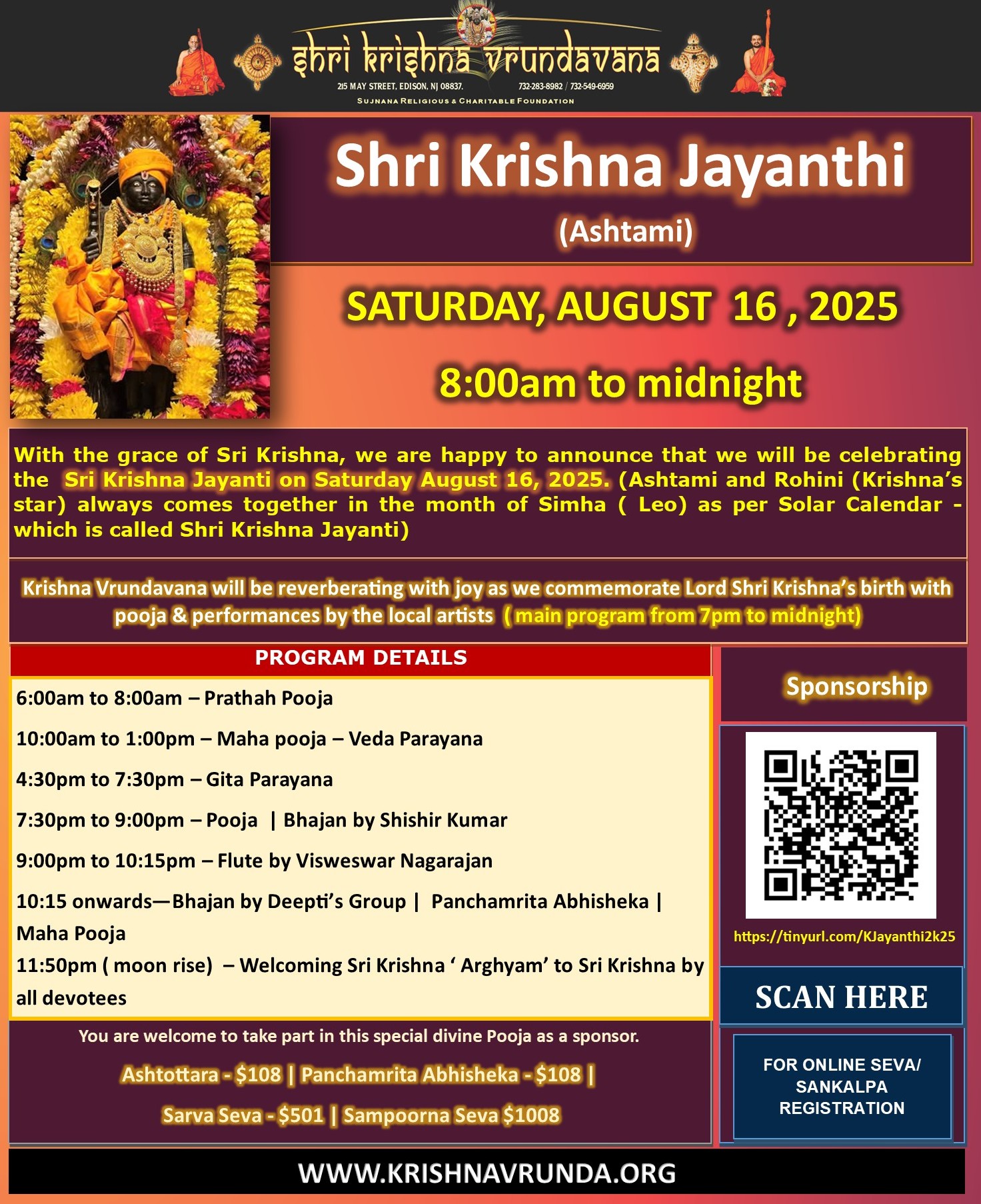 Celebrate the divine birth of Lord Krishna with us at Shri Krishna Jayanthi (Ashtami) on Saturday, August 16, 2025, from 8:00 AM to Midnight.