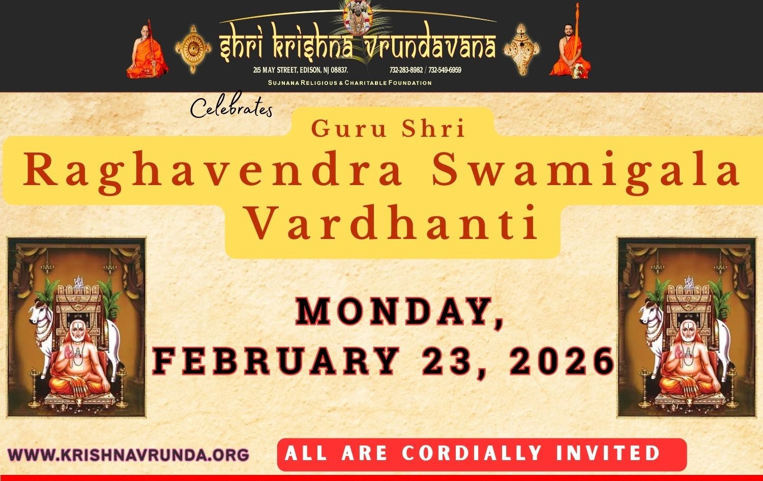 Sri 1008 Sri Suguneendra Theertha Swamiji of Udupi Sri Puthige Matha established the Shri Krishna Vrundavana in December 2002. Shri Krishna Vrundavana is affiliated to Sujnana Religious & Charitable Foundation (SRCF. Until Jan 2009, the organization conducted various events at different Hindu temples including the Dwarkadish temple, Parlin. In Jan 2009 Krishna Vrundavana found its new permanent location at 215 May Street, Edison, NJ.