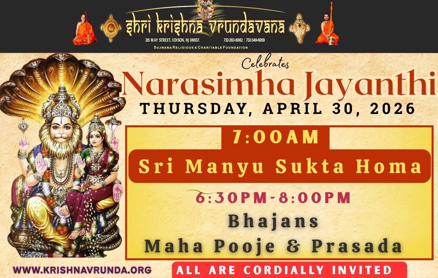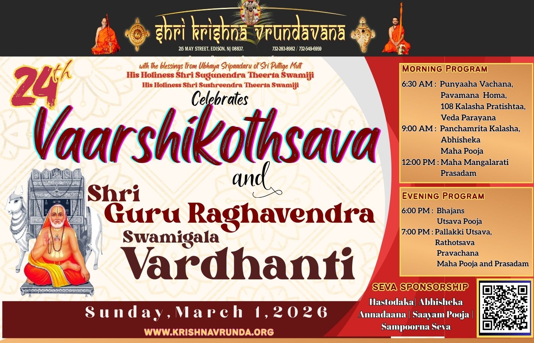 Sri 1008 Sri Suguneendra Theertha Swamiji of Udupi Sri Puthige Matha established the Shri Krishna Vrundavana in December 2002. Shri Krishna Vrundavana is affiliated to Sujnana Religious & Charitable Foundation (SRCF. Until Jan 2009, the organization conducted various events at different Hindu temples including the Dwarkadish temple, Parlin. In Jan 2009 Krishna Vrundavana found its new permanent location at 215 May Street, Edison, NJ.