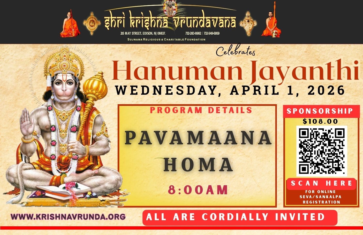 Hanuman Jayanthi Celebration –April 1, 2026 CLICK HERE TO SPONSOR FOR HOMA × |